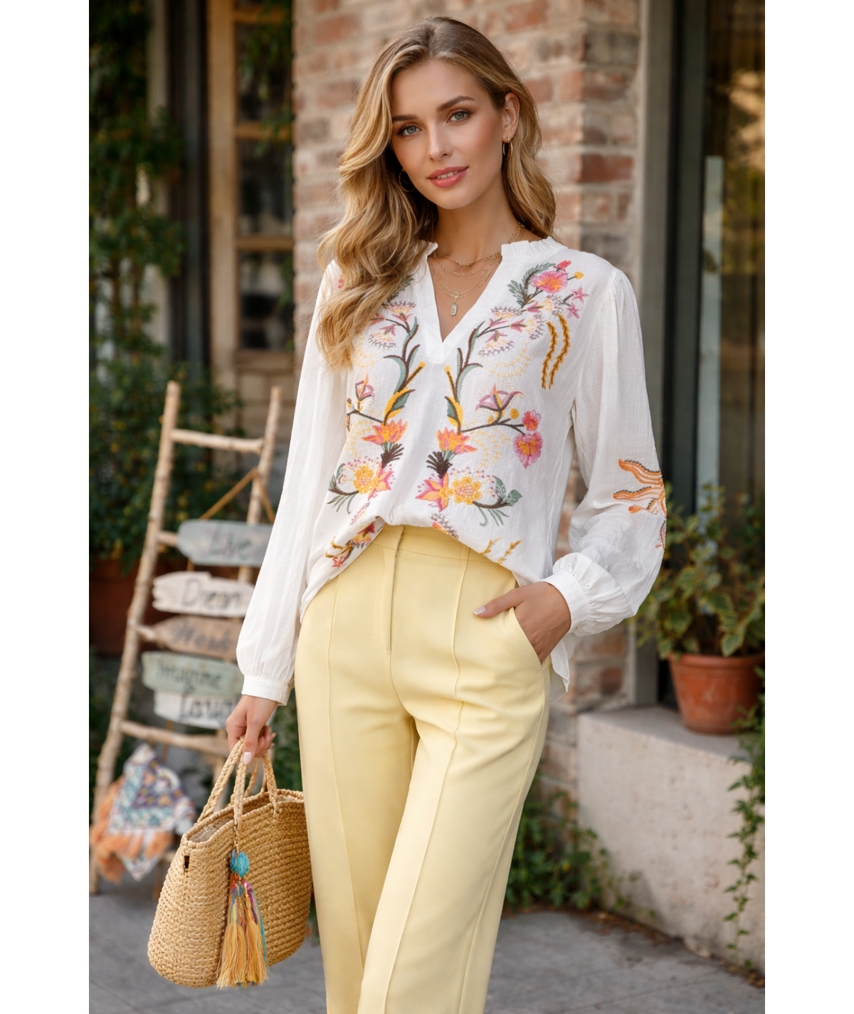 BLUSA FEMENINA DE ESTILO ROMANTICO CON UN DELICADO BORDADO FLORAL MULTICOLOR QUE APORTA UN TOQUE ARTESANAL Y ELEGANTE.