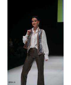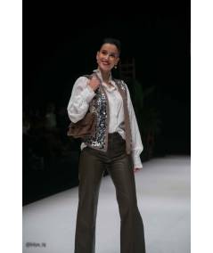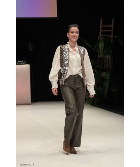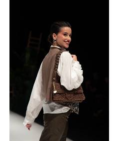CHALECO ABIERTO MARRÓN CHOCOLATE CON DETALLE DE LENTEJUELAS EN COLOR PLATA.