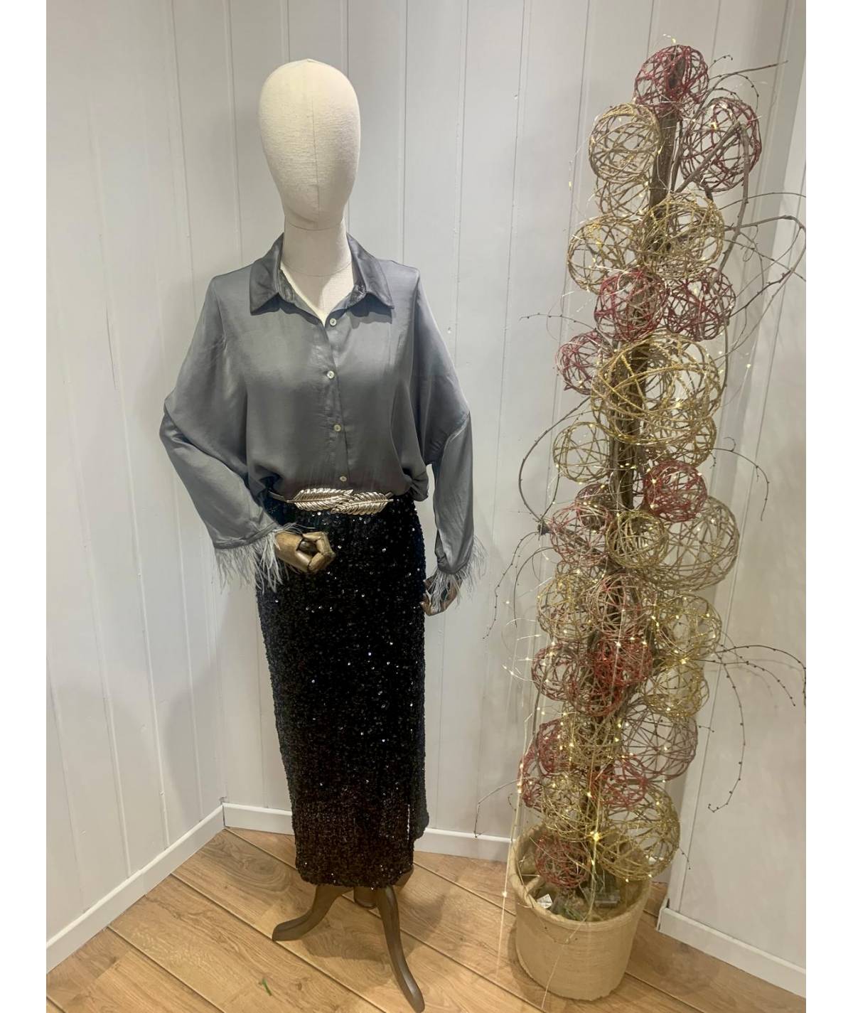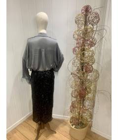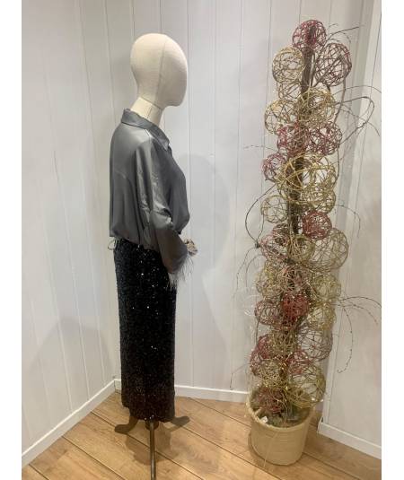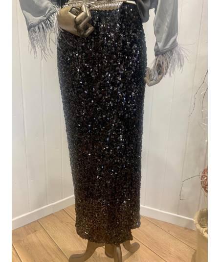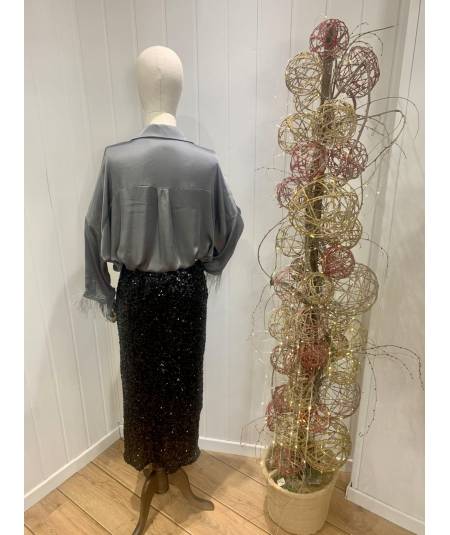 CINTURA ALTA CON GOMA ELÁSTICA Y PEQUEÑA ABERTURA LATERAL.