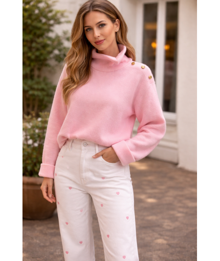 Jersey de punto en un tono rosa suave, con un estilo elegante y muy femenino. Destaca por su cuello alto ligeramente vuelto, que aporta calidez y un aire sofisticado.