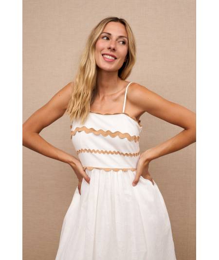 TIRANTE FINO Y ESCOTE RECTO CON DETALLE EN EL PECHO DE ONDAS EN COLOR CAMEL.